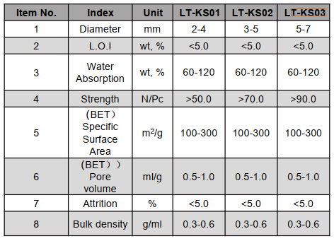 LT-KS type products have the characteristics of high compressivestrength and low abrasion. It can be adjusted by size, porestructure, and bulk density according to requirements.It is widelyused for adsorbent, hydrodesulfurization catalyst carrier,hydrodenitrogenation catalyst carrier, and CO sulfur tolerant shiftcatalyst carrier and other fields.