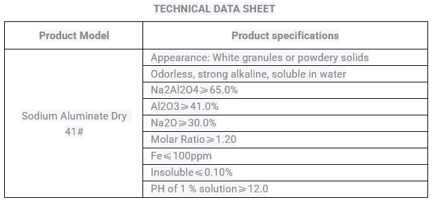 Solid sodium aluminate is derived by dissolving alumina tri-hydrate into sodium hydroxide and water. The solution is then made solid by removing the free moisture and then granulated. Sodium aluminate dry are white granules that are readily soluble in water. It is colorless, odorless, tasteless and strongly alkaline.