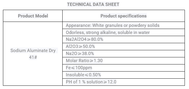 Solid sodium aluminate is derived by dissolving alumina tri-hydrate into sodium hydroxide and water. The solution is then made solid by removing the free moisture and then granulated. Sodium aluminate dry are white granules that are readily soluble in water. It is colorless, odorless, tasteless and strongly alkaline.
