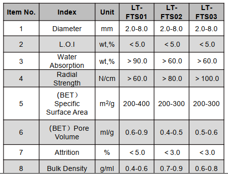 LT-FTS type products have the characteristics of high compressive strength and low abrasion. It can be adjusted by size, pore structure,and bulk density according to requirements. It is widely used for adsorbent, hydrodesulfurization catalyst carrier, hydrodenitrogenation catalyst carrier, and CO sulfur tolerant shift catalyst carrier and other fields.