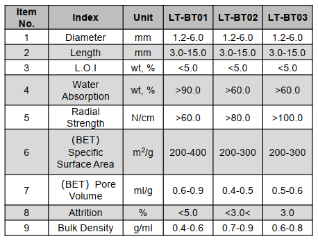LT-BT type products have the characteristics of high compressive strength and low abrasion. It can be adjusted by size, pore structure, and bulk density according to requirements. It is widely used for adsorbent, hydrodesulfurization catalyst carrier, hydrodenitrogenation catalyst carrier, and CO sulfur tolerant shift catalyst carrier and other fields.